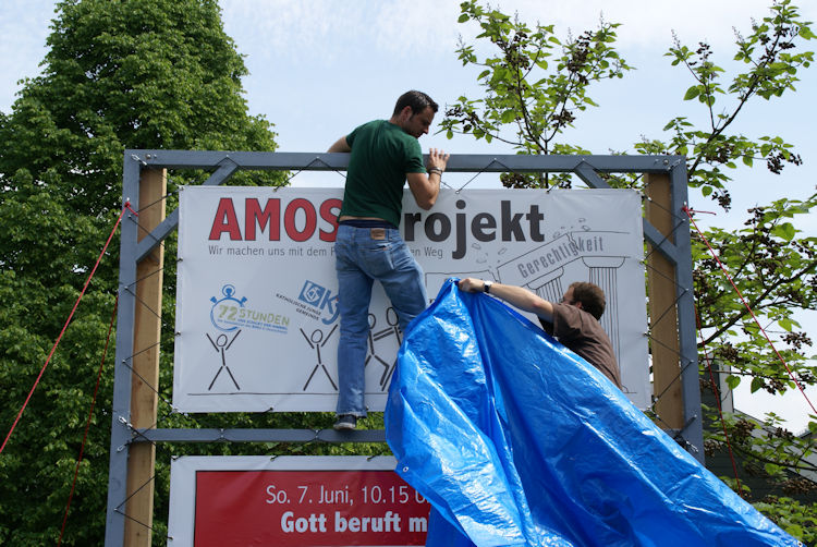 Es war klar, dass auch die Jugendlichen der KJG St. Peter/St. Paul, die sich für die 72- Stunden-Aktion, die große Sozialaktion des BdKJ (Bund der katholischen Jugend) angemeldet hatten, in das "Amos-Projekt" einbezogen werden sollten. Die Jugendlichen bekamen die Aufgabe, von Donnerstag 7. Mai 17.07 Uhr bis Sonntag 10. Mai 17.07 Uhr eine Plakatwand auf dem Gelände der Pauluskirche an der Kreuzung B 35/ B3 zu erstellen, ein Plakat für unseren Amosprozess zu entwerfen, einen Trailer zu erstellen, der auf das Projekt aufmerksam macht und am Samstag verkleidet wie zur Zeit des Amos auf dem Markt Flyer zu verteilen.