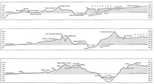 Das Westjordanland ist seiner Formation nach ein Höhenrücken. Er zerfällt in verschiedene Höhenzüge, die fast unmerklich ineinander übergehen und im Altertum stark bewaldet waren.