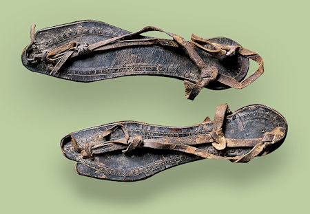 Diese Sandalen wurden bei Massada gefunden. Wahrscheinlich gehörten sie einem der jüdischen Aufständischen, die sich gegen die römische Herrschaft erhoben hatten und die Feste des Herodes zwischen 66 und 73 besetzt hielten - Beispiel für Schuhwerk aus der damaligen Zeit.