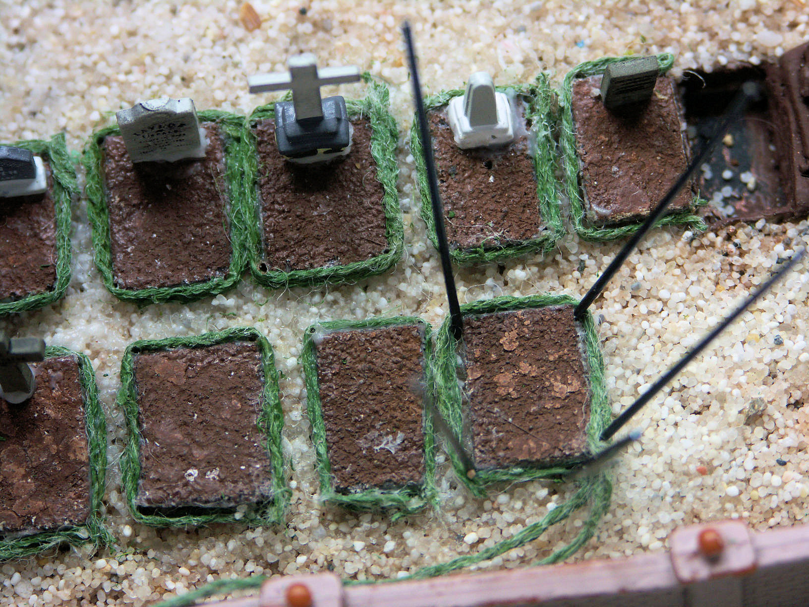 Um die Grabfelder, die aus eingefärbtem und auf Karton aufgezogenem Sandpapier hergestellt wurden, wird gefärbte Wolle geleimt. Schräg eingeschlagene Stahlnadeln sorgen dafür, dass sich die gespannte Wolle eng an die Kanten des Feldes anlegen und den das Eindruck einer Einfassung durch eine nieder Hecke hinterlässt.