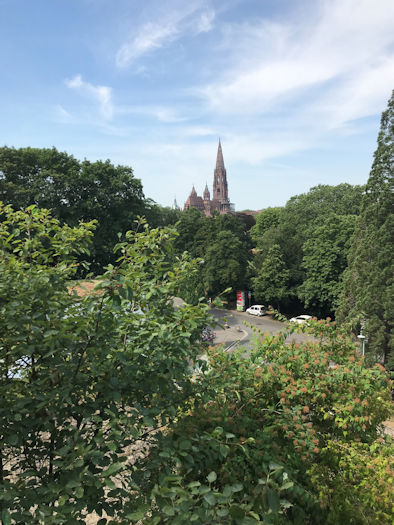 "Ettenheim liegt malerisch an einem Ausläufer der Berge des Schwarzwaldes. Von weitem her sieht man schon die Kirche emporragen, die auf einem Hügel am südlichen Ende der Stadt thront; sie ist hoch und weit, am Sonntag aber dicht besetzt von der frommen Gemeinde. Zur Zeit Karl Martells vom Bischof Etto gegründet, im dreißigjährigen Krieg vollkommen infolge einer Schlacht in nächster Nähe verbrannt, wurde sie nach einem einheitlichen, zweckmäßigen Plane wieder erbaut und zum Schutz mit Graben und Stadtmauer umgeben. Sie gehörte mit der Umgebung zum Bisthum Straßburg. Zwei Stunden davon im Osten war das Kloster Ettenheimmünster, von wo aus die Stadt mit Geistlichen versehen wurde. Zwischen Ettenheim und Ettenheimmünster ist die große Kirche St. Landolin, an der Stätte gebaut, wo in heidnisch=alamannischer Zeit ein Glaubensbote aus Irland den Märtyrertod erlitt. In dem nur eine Viertelstunde entfernten Altdorf zeigt man noch die Hütte, wo der fromme Mann sich aufhielt, ehe er in dem Urwald, wo jetzt ihm zu Ehren der prachtvolle Tempel steht, eine Einsiedelei sich erbaute. Der Jäger des nahen Grundherrn Giso soll dem Betenden das Haupt abgeschlagen haben. Da, wo das Blut des Glaubensboten floß, sprudelt jetzt eine Quelle, welcher Heilkraft für kranke Augen zugeschrieben wird; in der Nähe zeigt man die Trümmer von der Burg Gisos. Andere Glaubensboten vollendeten, was Landolin begonnen, und in der Nähe entstand das Benedictinerkloster Ettenheimmünster; als es aufgehoben wurde, war darin ein Gymnasium und eine Buchdruckerei. - Rings um St. Landolin stehen prachtvolle Buchenwälder, in welchen Enghien Rehe und Hirsche jagen konnte.